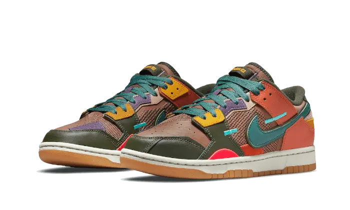 The Nike Dunk Low Scrap Archeo Brown features an upper made from a mix of leather, suede, and mesh. With a predominantly brown upper, the base features a multi-colored overlay: khaki, orange, blue, red, and purple complete the color scheme.